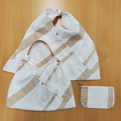 織物生地から縫製や革小物に至るまで、それぞれがすべて群馬県桐生市に拠点を置く職人が手がけたあずま袋(大と小)とポーチ、革ハンドルです。