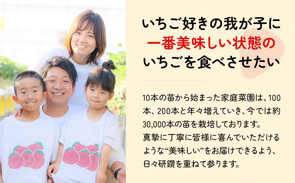 木熟にこだわった、“新鮮”で“完熟”した摘みたてのいちごです。10本の苗から始まった家庭菜園は、100本、200本と年々増えていき、今では約20,000本の苗をもっていちご園をオープンする運びとなりました。