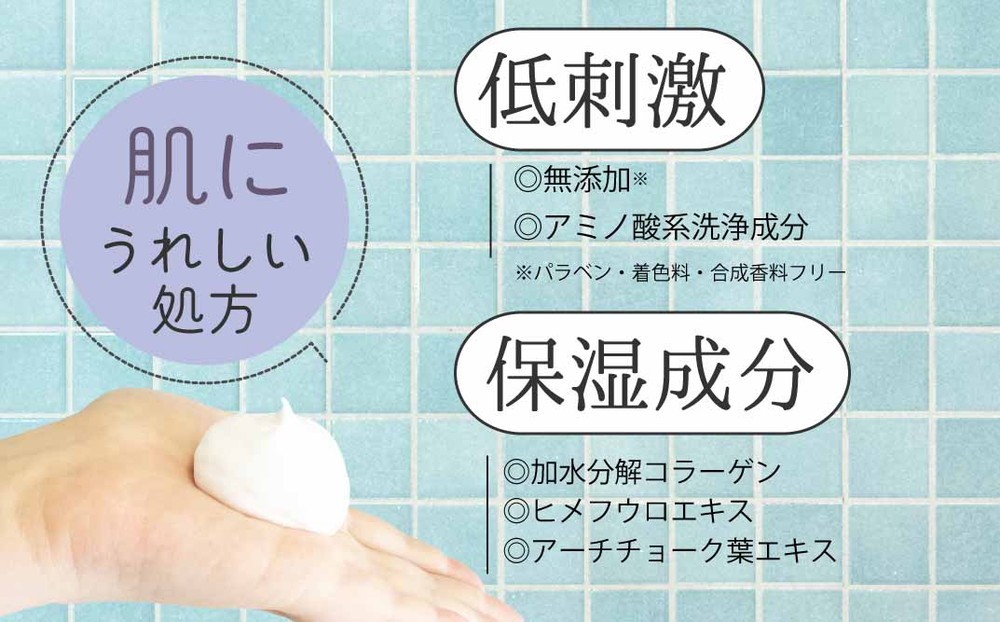 防腐剤、着色料、合成香料は一切不使用でパッチテスト済。お肌にやさしい洗浄力で汚れをスッキリ落とし、ぷるツヤ肌へ。