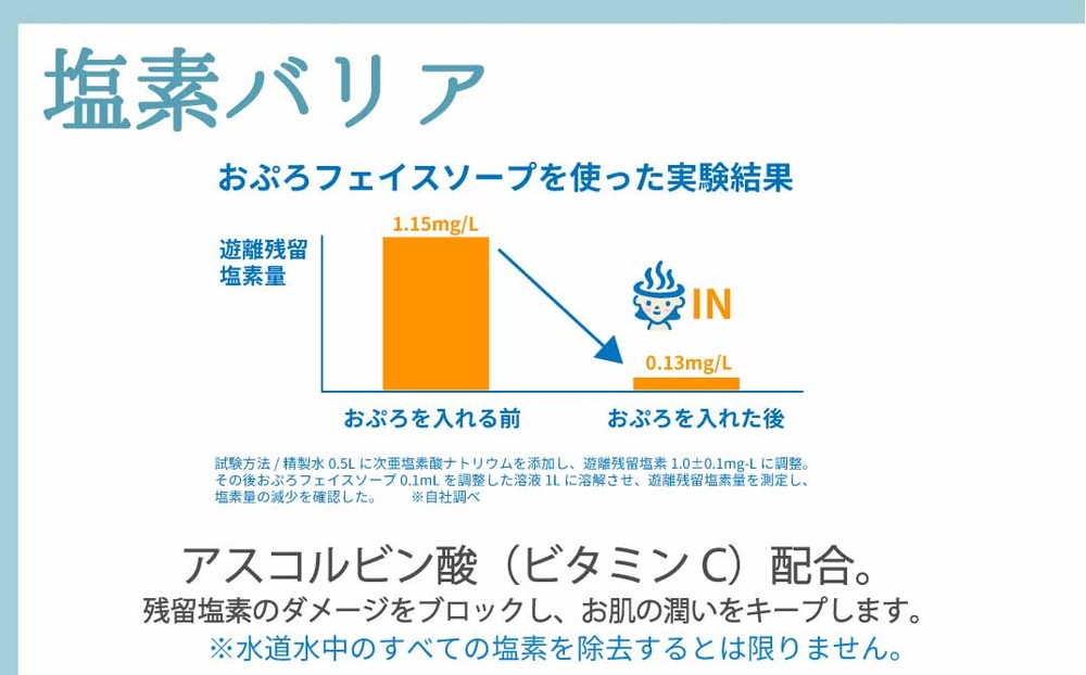 残留塩素から肌を守る「塩素バリア」成分とお肌にハリを与える3種の美容成分(加水分解コラーゲン、ヒメフウロエキス、アーチチョーク葉エキス)配合。