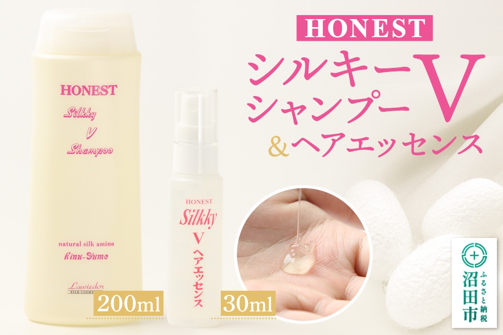 ★防腐剤や旧表示指定成分無添加! HONEST(ホーネスト)シルキーVシャンプー200ml・シルキーVヘアエッセンス30ml(お試しサイズ)2点セット