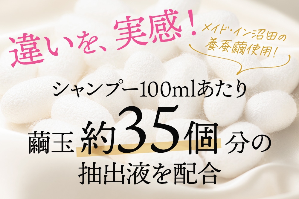 メイドイン沼田の繭をふんだんに使用し、丁寧に製造された化粧品です。シャンプーは泡パックを5~10分ほどしてご使用ください。エッセンスはシャンプー後・または髪を整える前に、ご使用ください。