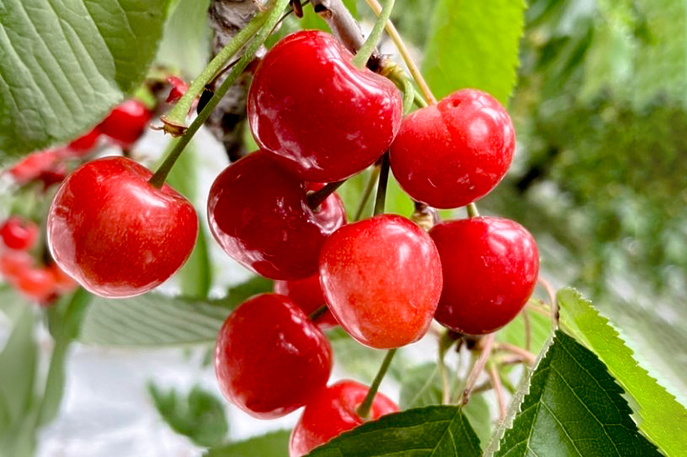 さくらんぼ:サクランボの代表格「佐藤錦」です。初夏の日差しを浴びて美味しく育ちました。甘さと程よい酸味とが絶妙なバランスです。お口の中ではじけるさくらんぼの食感を是非ご堪能ください。