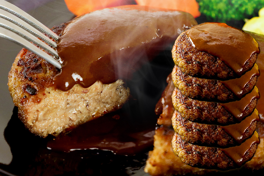 上州牛ハンバーグ:上州牛のみを使用した、贅沢なハンバーグ。焼成済みなので、袋のまま18分弱火で温めるだけで食べられます。ソースも弱火で5分程度温めてください。強火で温めるとバターが分離してしまう恐れがあります。