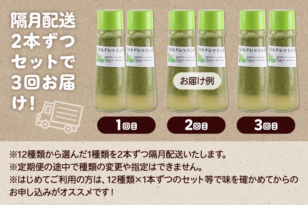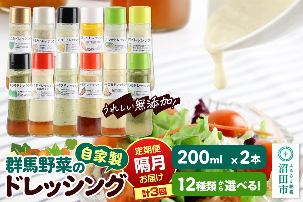 サラダはもちろん、おかずの調味にも♪ 【定期便3回を隔月でお届け】自家製・群馬産野菜で手作りドレッシング 単品 200ml×2本【選べる種類】泙川食品 [どれっしんぐ ドレッシング 山わさび くるみ シーザー 青じそ にんじん ゆず バジル フレンチ みそごま 中華 玉ねぎ えごま]