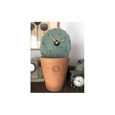うちわサボテンに時計のムーブメントを埋め込んだアート作品。テレビにも出演したオリジナルデザインの時計です。