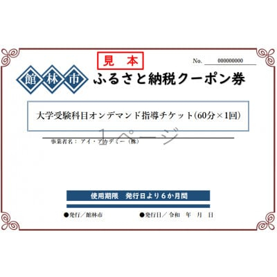 | 容量 | ■お礼品の内容について ・大学受験科目オンデマンド指導チケット[60分×1回分] サービス提供地:館林市 ■提供サービス 大学受験科目オンデマンド指導チケット(60分×1回分) |