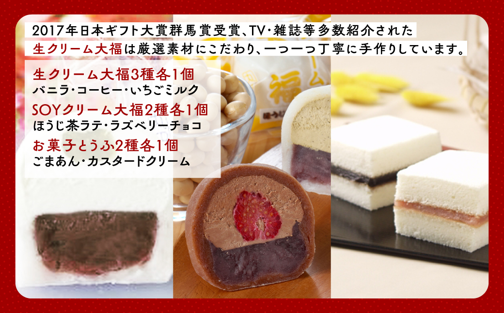 2017年日本ギフト大賞群馬賞受賞、TV・雑誌等多数紹介された生クリーム大福は厳選素材にこだわり、一つ一つ丁寧に手作りしています。 ※画像はイメージです ■原産地/加工地/製造地/宿泊地/サービス提供地 製造地:群馬県安中市 ■原材料 【生クリーム大福】 餅米(国産)、生クリーム、小豆、砂糖、ストロベリーソース、コーヒー、天然バニラ、ゼラチン、うぐいす豆 / 酵素(大豆由来)・酸味料(クエン酸)・着色料(クチナシ・紅麹) (一部に乳成分・ゼラチン・大豆を含む) 【SOYクリーム大福】 餅米(国産)、豆乳クリーム、小豆、砂糖、ラズベリー、チョコレート(ベルギー産)、ほうじ茶、ココア、ゼラチン / 酵素(大豆由来) (一部に大豆・ゼラチンを含む) 【お菓子とうふ】 卵白、小麦粉、豆乳(国産丸大豆)、砂糖、カスタードクリーム、ごま餡、植物油脂、蜂蜜、コラーゲンペプチド、塩 / 膨張剤 (一部に乳成分・卵・小麦・大豆・ごま・豚を含む) ■保存方法 冷凍18℃以下 ■注意事項 解凍・再冷凍を繰り返すと商品の品質を損ないます。