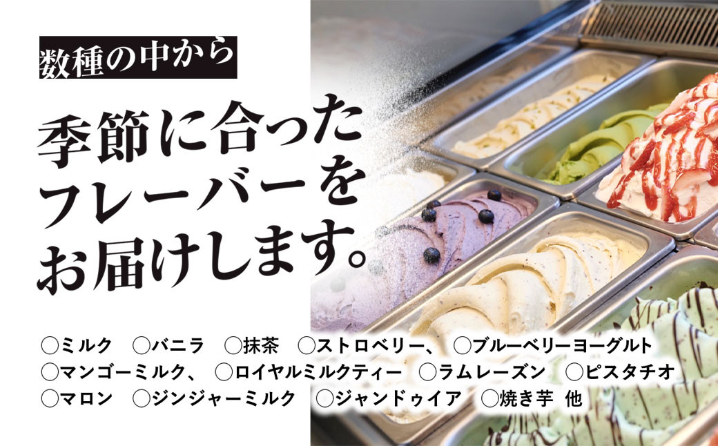 ミルク、バニラ、抹茶、ストロベリー、ブルーベリーヨーグルト、マンゴーミルク、ロイヤルミルクティー、ラムレーズン、ピスタチオ、マロン、ジンジャーミルク、ジャンドゥイア、焼き芋 他