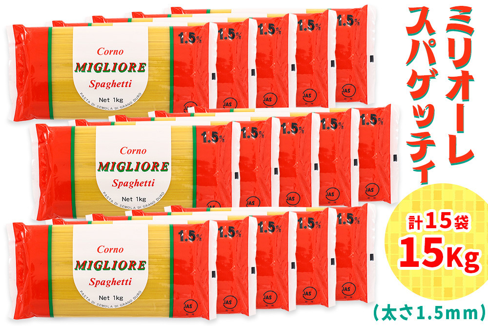| 容量 | ■内容量:ミリオーレスパゲッティ(太さ1.5mm) 1kg×15袋 ■ゆで時間:6分 |