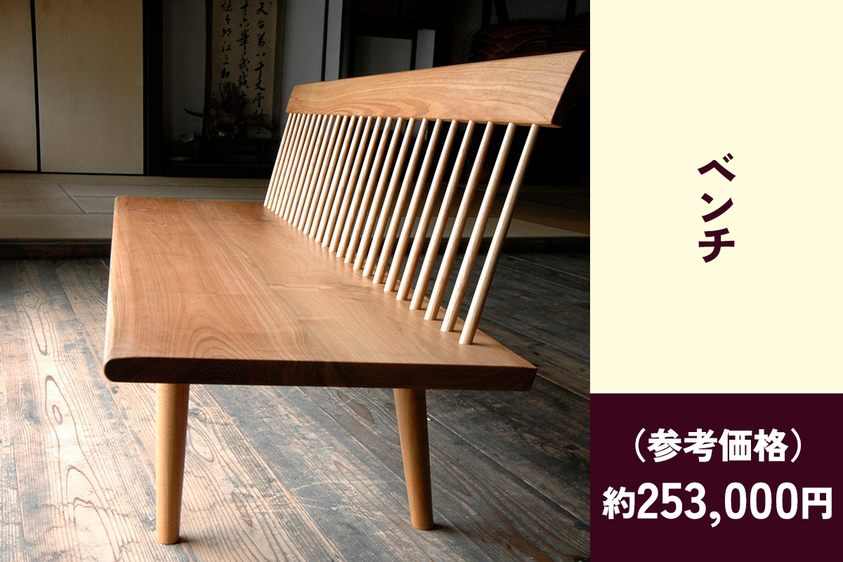 国産広葉樹 (ナラ、栗、クルミ、桜など) を原木から仕入れ、2から3年自然乾燥した材料を使用し、テーブルやイス、キャビネットなどを製作します。