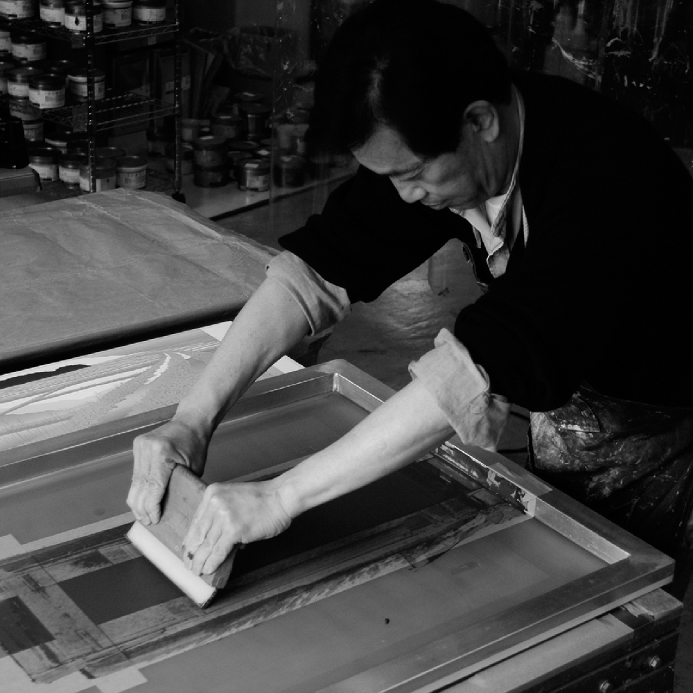 完成した版(スクリーン)の下に版画紙を置き、あらかじめ調合したインクを版(スクリーン)の上にのせて、スキージ(へら状の道具)で一気に摺り上げます。