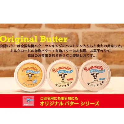 全国発酵バターランキングベスト10にランクインしたミルクロード自慢の発酵バターと毎日食べても飽きずに口溶け爽やかな有塩バター、美味しさをお料理に力を発揮してくれる無塩バターの3種類セットとなります。巷では社会現象ともなりつつある人気の発酵バターは乳酸発酵させた生クリームを原料に創り出され、バター職人高橋一夫氏が日本人の嗜好に合うバターに完成させました。パンの味を引き立てるミルクロードのバターの3種はコロナ禍における家でのお食事にぴったりのアイテムです。是非、冷蔵庫の人気者としてご賞味ください