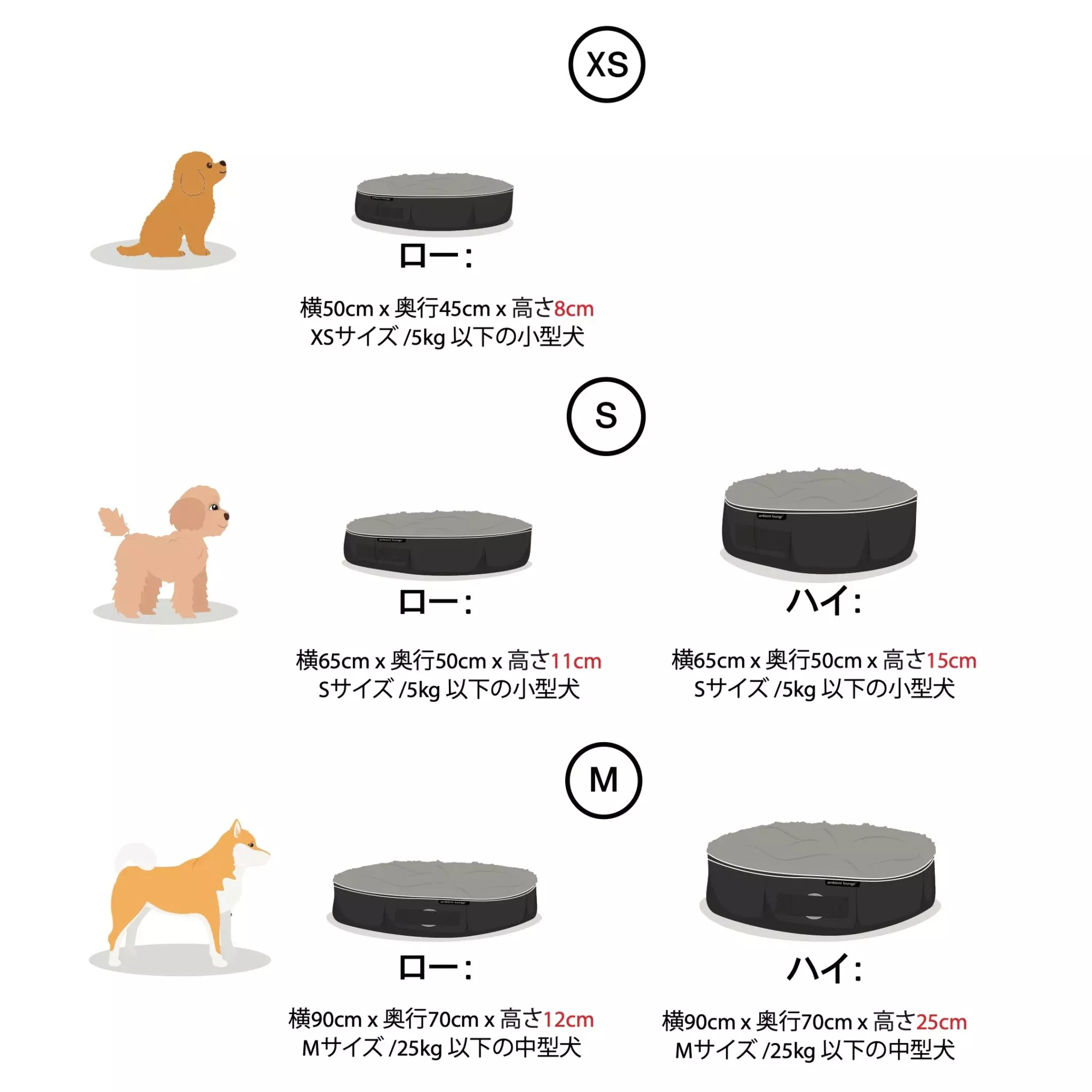 世界中で永く愛されてきたアンビエントラウンジのペットラウンジを日本のお客様の声をもとに改良しました。 小型犬にも登りやすくするため本体の高さを抑え、さらに裏面ジッパーの形状を大きく変更。 新しく採用されたジッパーシステムにより、本体カバーの洗濯が劇的に簡単になりました。 また、本体カバーを複数用意することで、インテリアに合わせたカラーチェンジが可能に。 さらに快適になった相棒のための居場所とより自由にカラフルに楽しめるオシャレな空間を体験してください。 ・犬達の習性を熟知した動物専門家監修によって設計されたデザイン ・外して洗濯機で洗えるカバーでいつでも清潔 ・独自開発の低反発ハイブリッド充填(プレミアム)で仕上げました。 まるでエアーベッドのような極上感でペット達はたちまち虜に。自分の体に合わせてじんわりと沈み込み、最高の睡眠をサポート。 体圧分散性に加え、反発力と弾力性により、特定部位への負担を避け体の痛みを軽減する働きが期待できます。 ・耐久性の高い素材(高密度1200デニールナイロン)のタフ設計。極上がライフタイムで続くサステナブルなベッド ・ベッドの中を常に新鮮な空気で換気し、熱がこもりにくいSmartVent™システム採用 ・オーダーを受けてから群馬県みなかみ町のラボで1点1点手作業作成の日本品質 【体重25㎏未満の中型犬向け】 パグ、ダックスフンド、ポメラニアン、柴犬、フレンチブルドッグ、シーズー、コーギー、ボーダーコリー、ビーグル、ボストンテリア、ビションフリーゼ、スピッツ 犬用 中型犬 ベッド ペットベット 洗える カバー