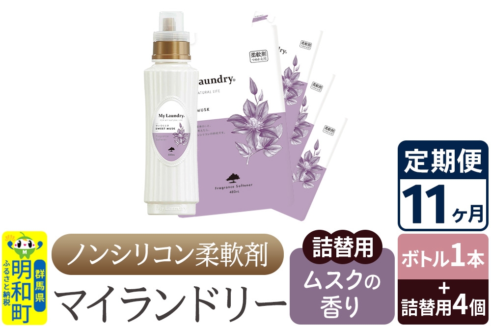 《定期便11ヶ月》ノンシリコン 柔軟剤 マイランドリー (ボトル1本+詰替用4個セット)【ムスクの香り】