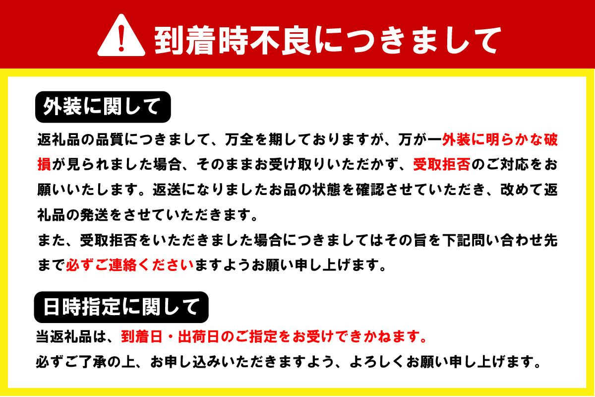 返礼品の品質に関しまして、万全を期しておりますが、万が一外装に明らかな破損が見られました場合、お受け取り頂かず、受け取り拒否をしていただき、下記問い合わせ先まで必ずご連絡くださいますようお願い申し上げます。