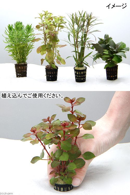 ポット、水草は低床に植え込み栽培して下さい、浮力がある為そのままでは浮き上がってしまう場合があります。