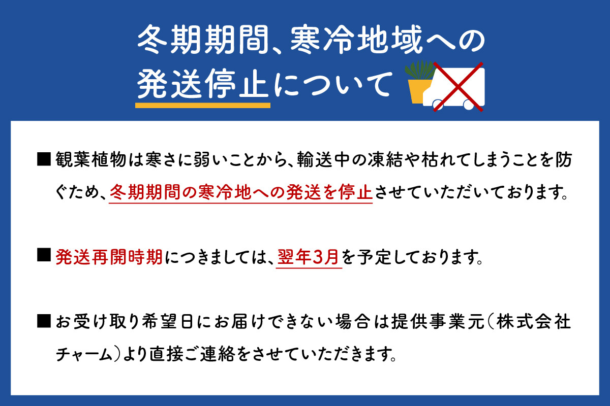 | 発送期日 | 入金確認後、準備ができ次第順次発送になります。 ※植物などの鮮度を保つために確実にお受け取り可能な日時を備考欄へ必ずご指定下さい。 ※お申し込みから1週間以降の日付をご指定ください。 ※記載がない場合は提供元(株式会社 チャーム)より直接ご連絡させていただきます。 ※日時指定等に関しましては、提供元(株式会社 チャーム)より直接ご連絡させていただきますので、サポート室へお問い合わせいただいた場合、お答えは出来かねますので、予めご了承ください。 【冬期期間、寒冷地域への発送停止について】 観葉植物は寒さに弱いことから、輸送中の凍結や枯れてしまうことを防ぐため、冬期期間の寒冷地への発送を停止させていただいております。 発送再開時期につきましては、翌年3月を予定しております。 お受け取り希望日にお届けできない場合は提供事業元(株式会社 チャーム)より直接ご連絡をさせていただきます。 |