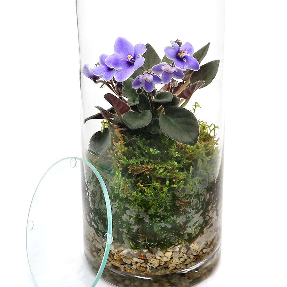 室内園芸の女王・セントポーリア! 苔テラリウム セントポーリア 品種おまかせ 円柱ボトルLサイズ 蓋付(1個)群馬県 千代田町 インテリア ナチュラル 自然 リラクゼーション 室内栽培 プレゼント ギフト 贈答用 送料無料 株式会社チャーム
