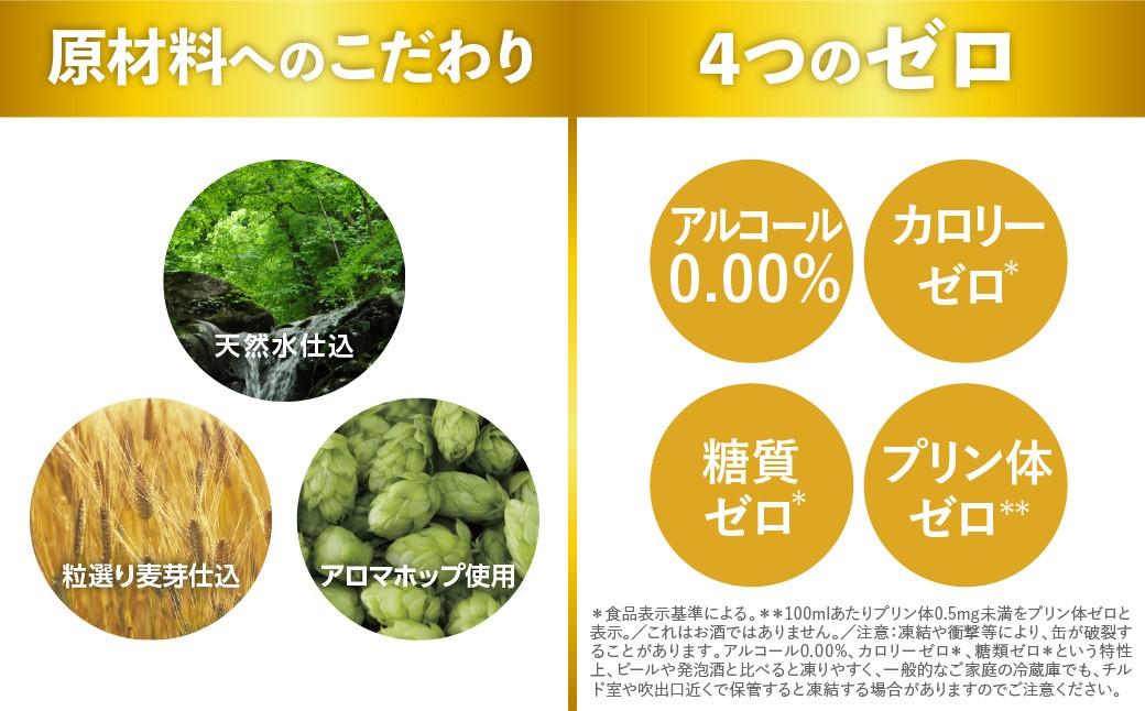 「アルコール度数0.00%」「カロリーゼロ※1」「糖質ゼロ※2」「プリン体ゼロ※3」の