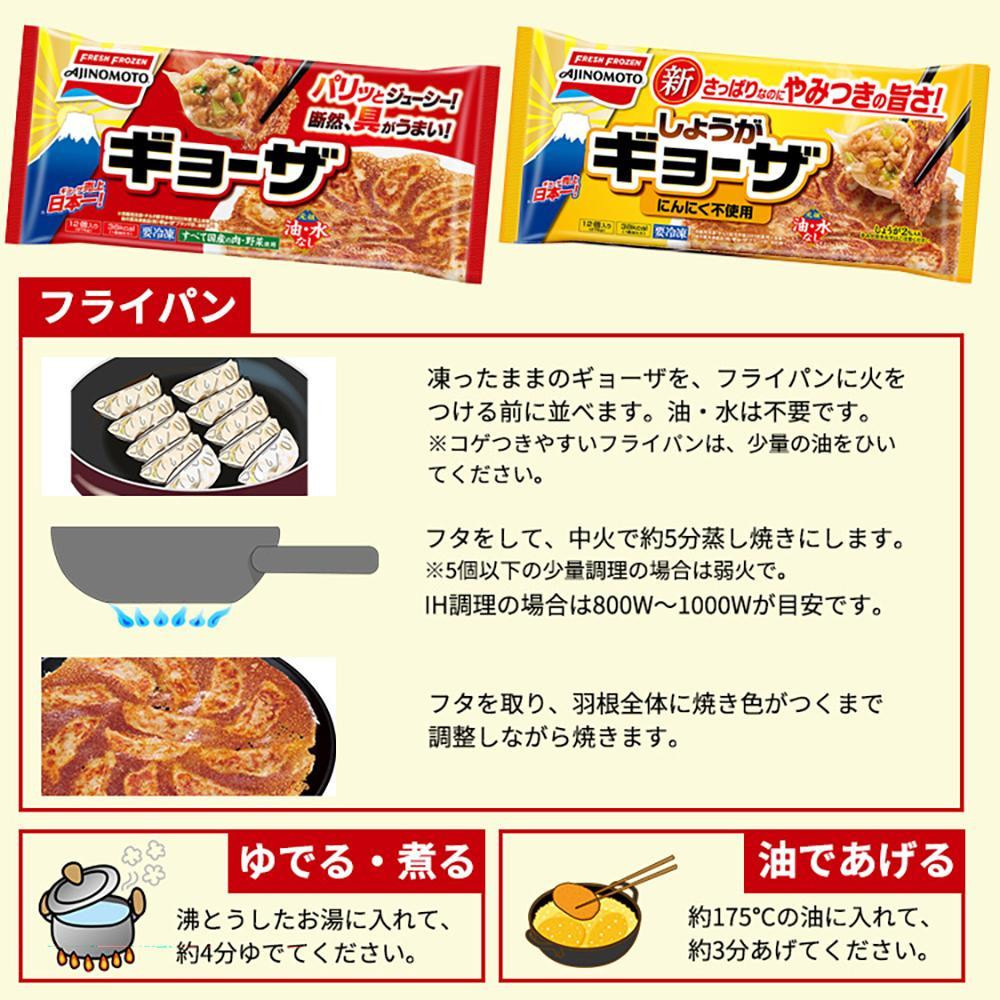 | 容量 | ザ・シュウマイ 9個入り(279g)×1パック 味の素の冷凍ギョーザ 12個入り(276g)×2パック レンジでギョーザ 10個入り(190g)×2パック しょうがギョーザ 12個入り(276g)×2パック |