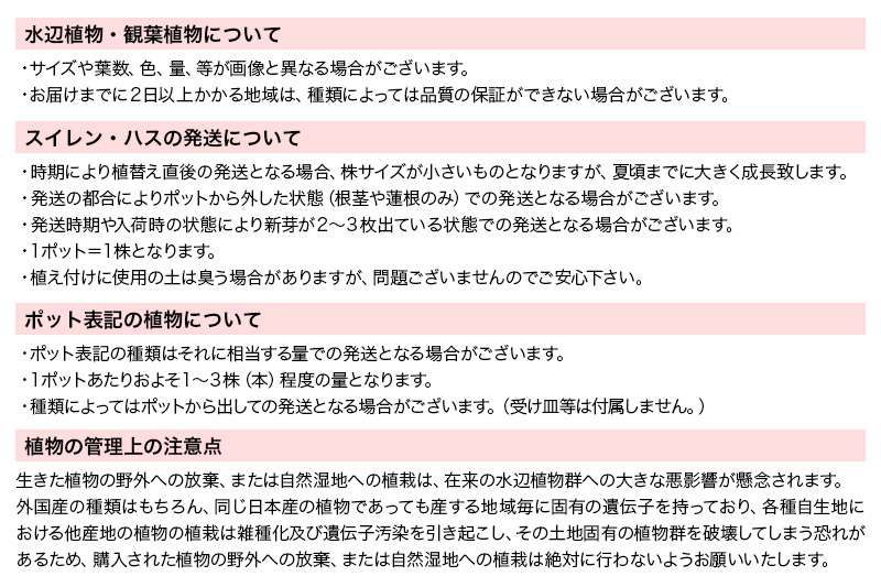 ※スイレン・ハス・一部水辺植物には有機肥料が施肥されています、肥料分の発酵により独特な臭いがありますので屋外での開封をお勧め致します。