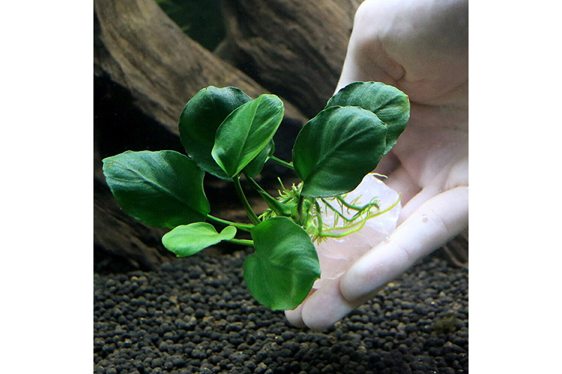 石や流木に着生(張り付く)する性質がある点、水質に幅広く対応し、低光量にも強く、CO2の添加も必要ないことから幅広い用途に使用できる種類です。