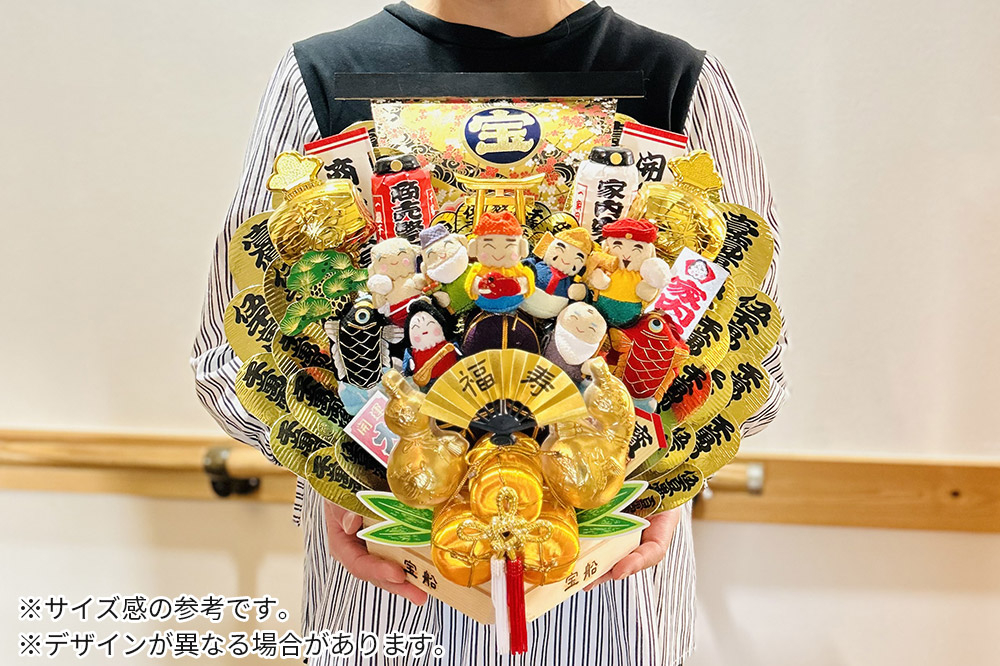 縁起物熊手の宝船の大型サイズです。縮緬(ちりめん)の七福神と鯉が乗っている豪華で華やかな返礼品です。宝船らしいデザイン製で、とても人気があります。