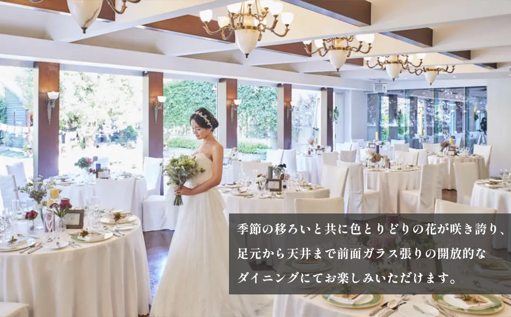 季節の移ろいと共に色とりどりの花が咲き誇り、足元から天井まで前面ガラス張りの開放的なダイニングにてお楽しみいただけます。