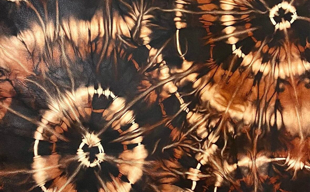 化学染料では表現できない深い黒さと茶褐色の色合いや、絞り柄ならではの一点物の色模様に恥じない素材になっています。