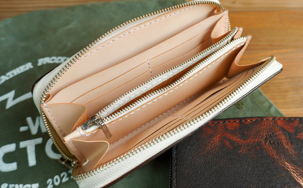 世界でも珍しい「奄美大島・泥染めレザー」を使った唯一無二の長財布 ラウンドファスナーウォレット(長財布) オフホワイト×シルバーファスナー 【11100-1139】
