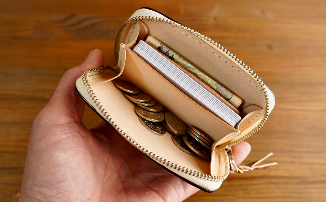 世界でも珍しい「奄美大島・泥染めレザー」を使った唯一無二の小銭入れ ラウンドファスナーコインケース(小銭入れ) オフホワイト×シルバーファスナー 【11100-1141】