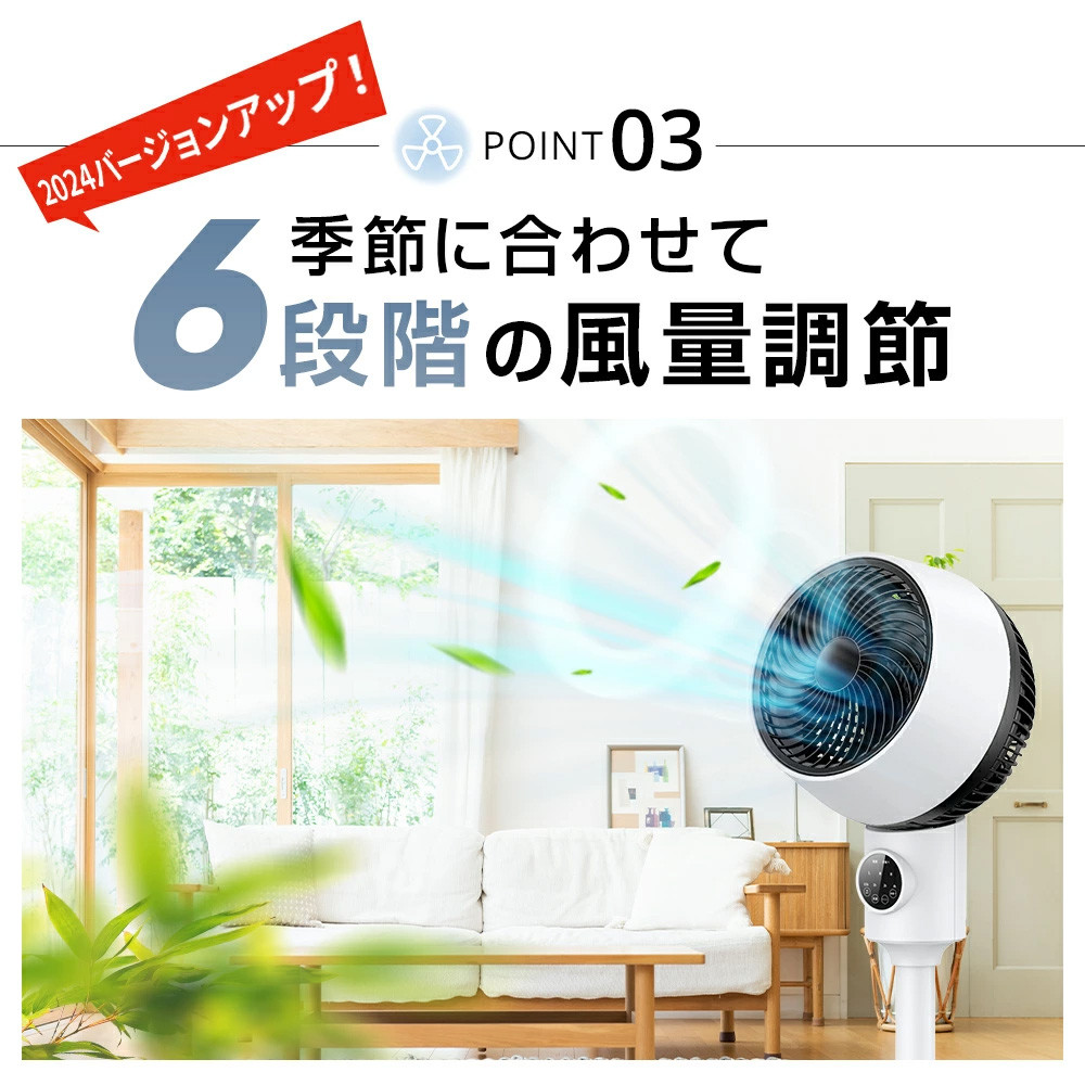 最大距離20mまでのパワフル送風で部屋の空気をもっと効率よく素早く循環させて、温度ムラを効果的に調整します。DCモーター搭載だから風を部屋の隅々まで送ることができる。6段階の風量を調整できます。最大風量を使用している場合、対応床面積はおよそ24畳です。リビング扇風機 直径17cmの3枚スパイラル羽根で風の吸い込み量を増やし、風を細かく切ることで、驚くほどの静音性を実現。