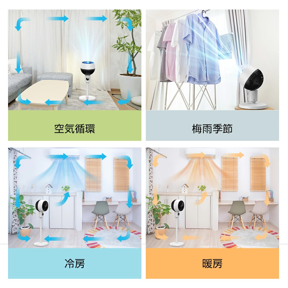 扇風機のみでの使いやすさはもちろん、空気循環を行うサーキュレーターとしても使える仕様です。エアコンを併用するタイプ、効率よく部屋の空気を循環させて、衣類乾燥と換気機能もそろっております。猛暑対策、梅雨、除湿、季節を問わず1年間フル稼働できる優れモノです。