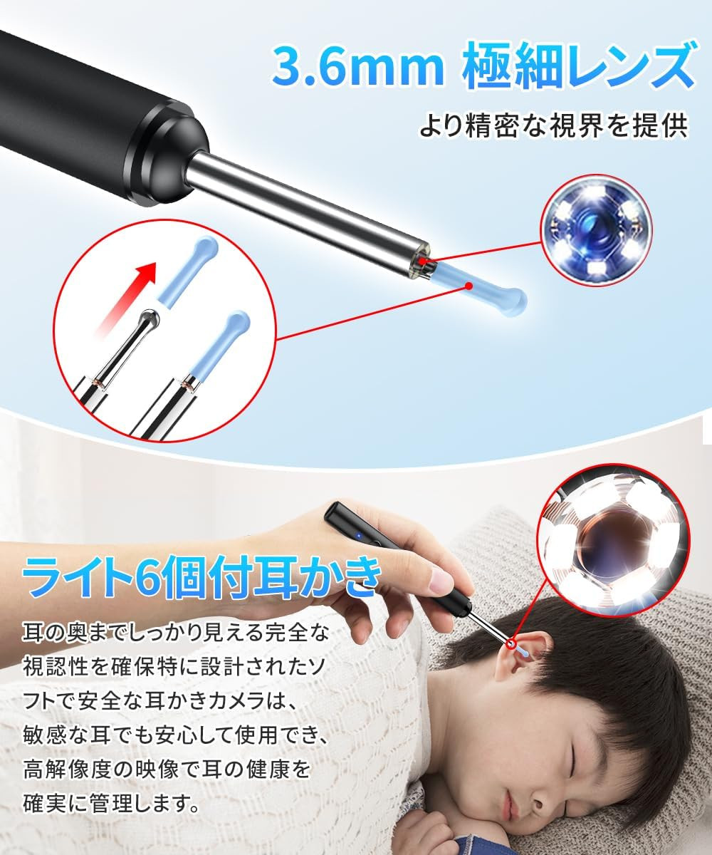 この耳かきカメラは、1000万画素の高解像度を実現し、耳の中の細部まではっきりと映し出します。3.6mmの極細レンズを採用しているため、耳に優しく、安全に使用できます。小さなレンズであっても、クリアで鮮明な映像を提供するため、耳掃除だけでなく、耳の状態チェックにも最適です。さらに、軽量かつコンパクトなデザインで持ち運びが便利なため、外出先でも簡単に使用でき、いつでもどこでも清潔な耳を保つことができます。
