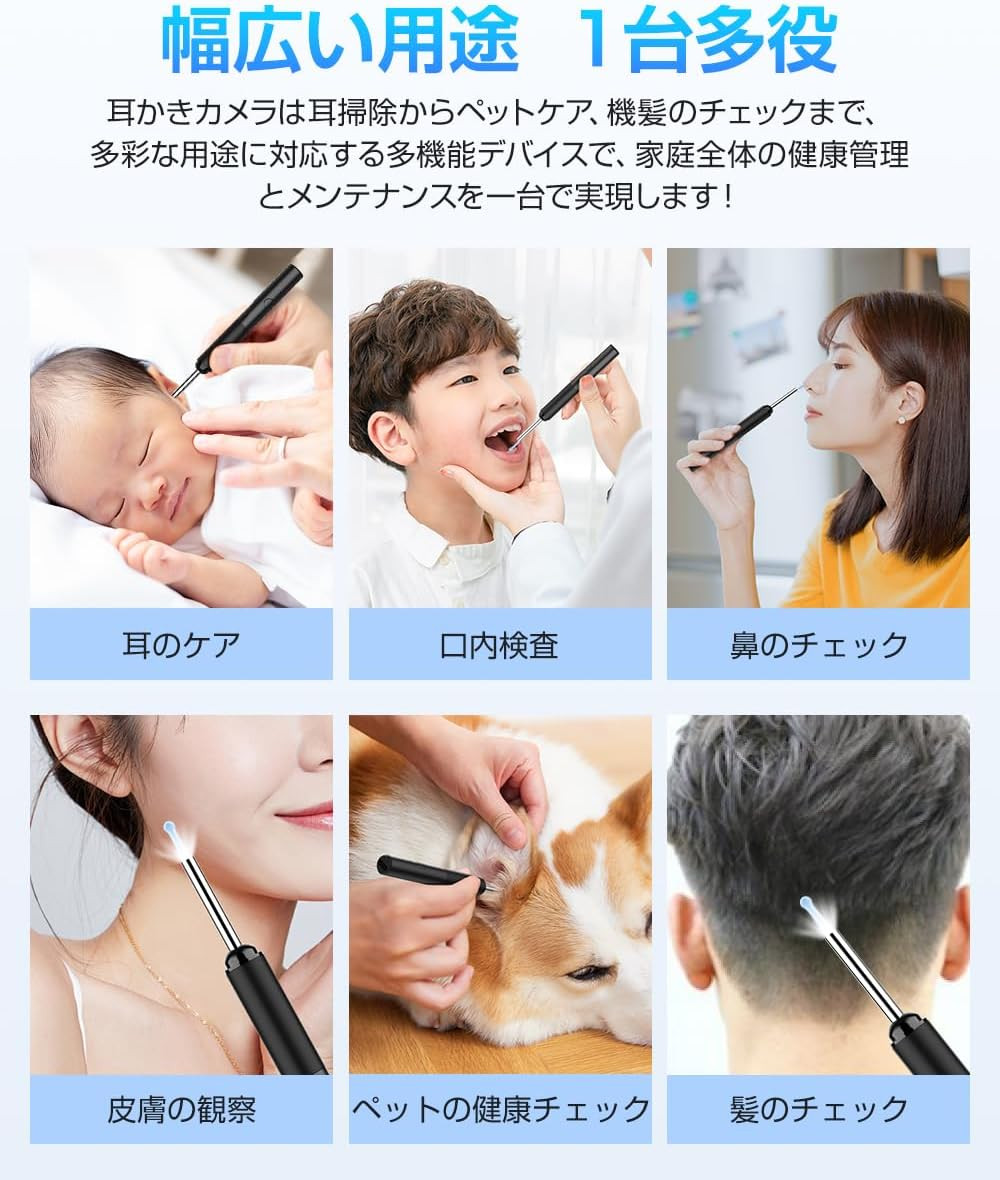 IP64防水仕様により、使用後の清掃も簡単で、水による故障を気にせずに使用できます。耳掃除以外にも、口や鼻、肌のチェック、さらにはペットの耳や体のケアにも利用できるなど、幅広い用途に対応しています。一台でさまざまなシーンで活躍するこのカメラ付き耳かきは、家族全員で使える多機能ツールとして重宝します。多用途かつ耐久性が高い設計で、長期間使用可能な優れた製品です。