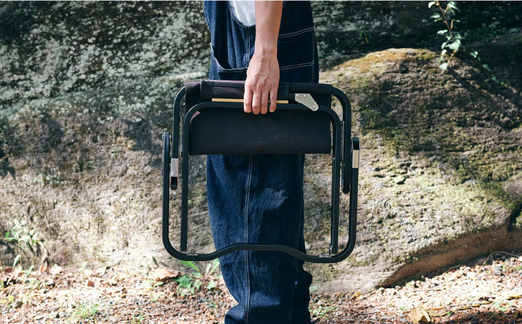 組み立ての煩わしさがなく、簡単に設営撤収できます。焚き火に最適な座面高30cm。ブラックのフレームと竹素材のアームレストのコントラストが美しいチェアです。