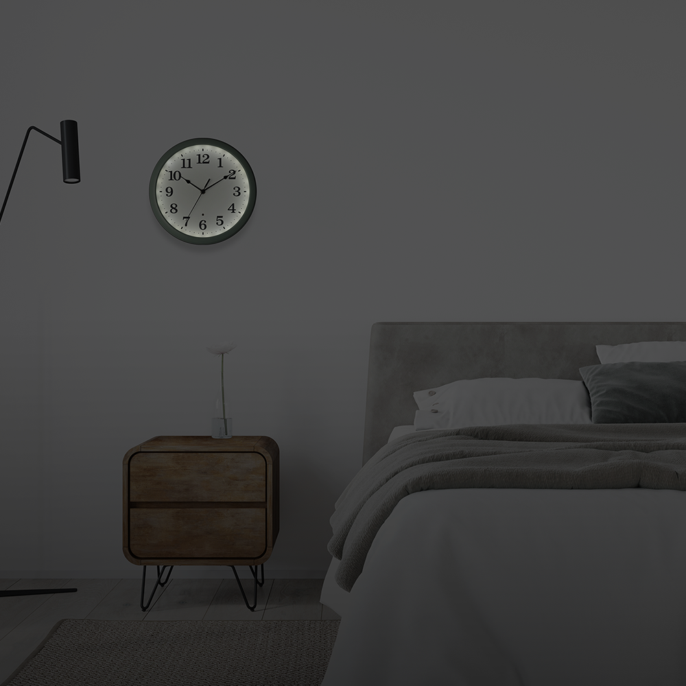 お部屋に馴染みやすいグレイッシュカラーの暗所自動点灯掛時計です。 使いやすさに配慮し、連続秒針・U D フォントを使用しています。