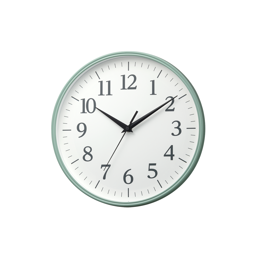 お部屋に馴染みやすいグレイッシュカラーの掛時計です。 使いやすさに配慮し、連続秒針・UDフォントを使用しています。
