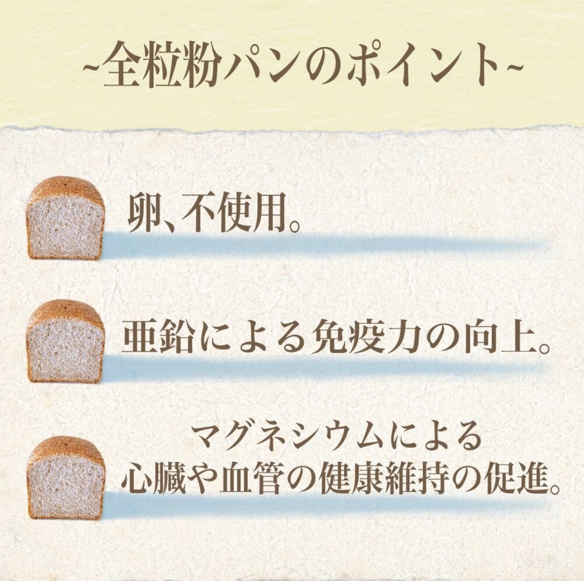 全粒粉食パンは、製粉した小麦粉より栄養分が豊富です。食物繊維が多く含まれていて血糖値を上げにくくする作用やコレステロールを低下させる効果が期待できます。