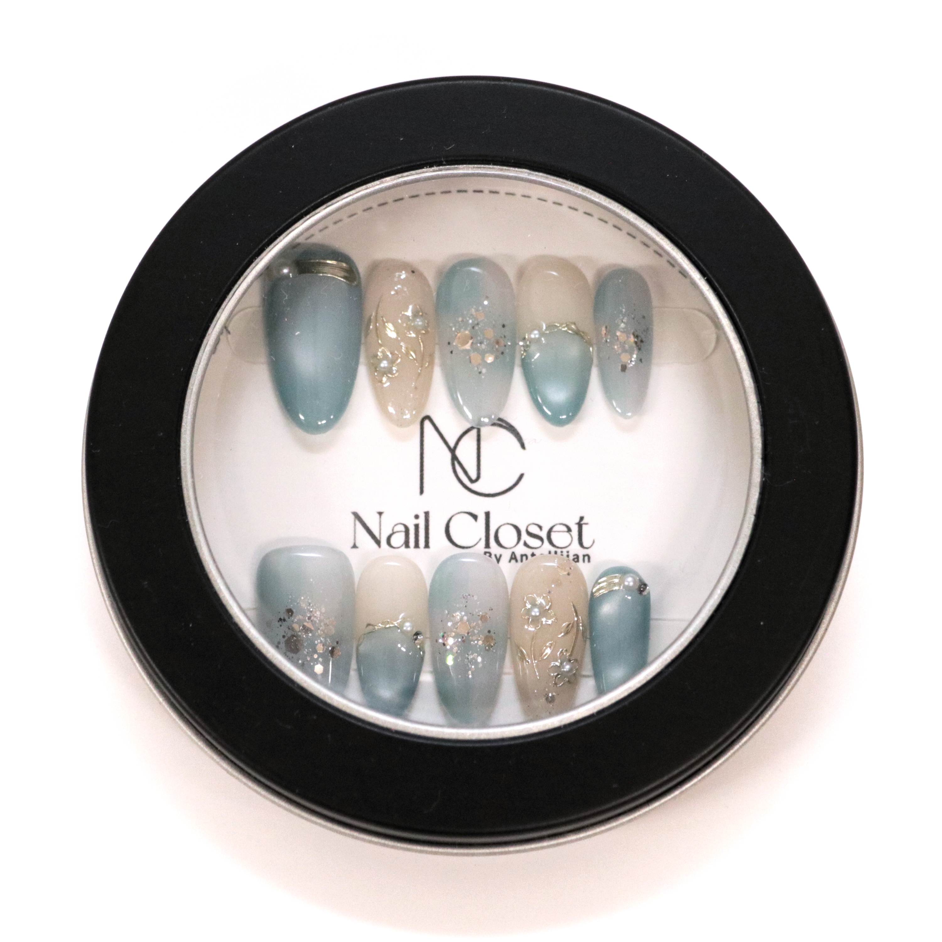 【朝露の庭】は、柔らかなパステルブルーのグラデーションと繊細なゴールドの輝きでエレガンスで洗練されたデザインとなっています。全体的に 柔らかく落ち着いた色合いで、先端の繊細なスカイブルーから爪の根元に向かって深く静かな色合いに穏やかに変化し、小さいながらも魅力的な花のアクセントと金色の輝きが滑らかで自然の美しさに仕上がっています。