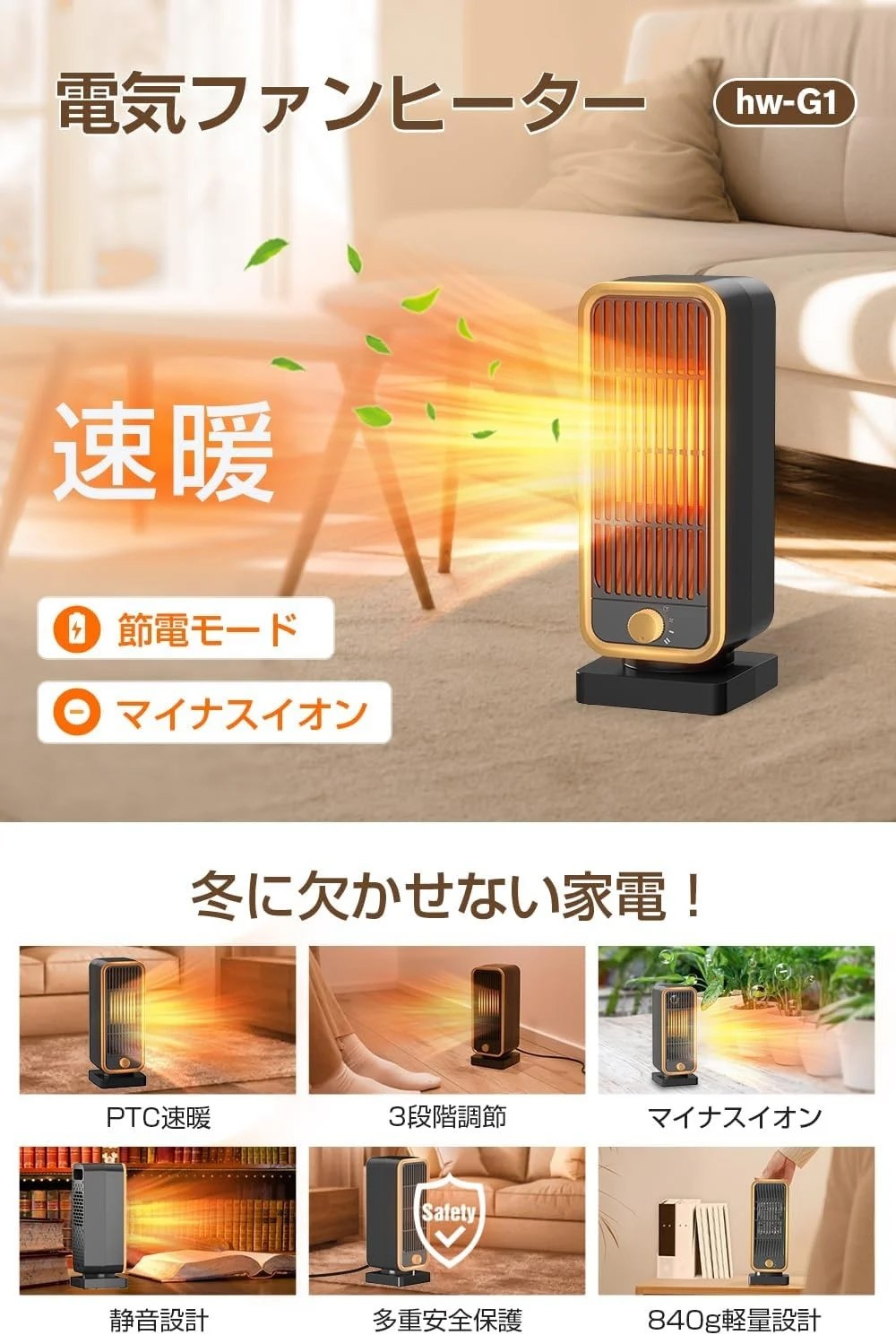 【2秒即速暖&マイナスイオン】本製品は電熱転換率の高いPTCセラミックを採用し、スイッチONで温風モードに切り替えてすぐ熱が出ます。待ち時間なしで暖かな風が吹き出しますので朝の身支度や、帰宅直後など、すぐに暖まりたいというときにピッタリです。更に、マイナスイオン発生器を装着し、清浄な空気だけでなく、新鮮も必要です。日常生活に森のような空気を満たされます。