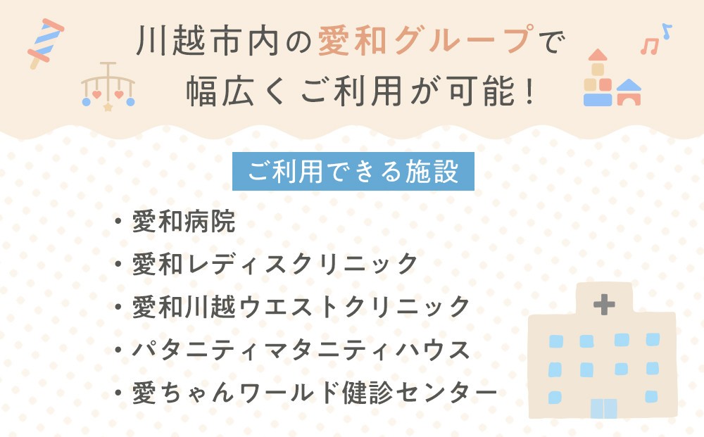 マタニティライフを豊かに、 妊婦さま、ご家族をしっかりサポート します! 全国でもトップクラスの分娩数を扱う愛和病院、愛和グループでは「出産」をコアとして、 妊婦さまとお子さま、そしてご家族全員の健康をサポートする体制を整えております。 妊娠初期から出産、産後・育児までの診療のみならず、 妊婦さま、ご家族に対するさまざまな面でのケアにも大きな力を注いでいます。ふるさと納税返礼品として、川越市内の愛和グループで幅広くご利用できるチケットになりますのでぜひご利用ください! ご利用できる施設 ・愛和病院 ・愛和レディスクリニック ・愛和川越ウエストクリニック ・パタニティマタニティハウス ・愛ちゃんワールド健診センター 使用できるサービス ・パタニティ・マタニティハウス(産後ケア) ・愛ちゃんワールド健診センター(乳児健診) ・SHOP ハートランド ・リラクゼーションルームAloha ・骨盤ケア ・メディカルスキンケア ・自費ワクチン ・4D 超音波 ・エムセラ ・自費乳がん検診 ・自費子宮がん検診 ・ホワイトニング