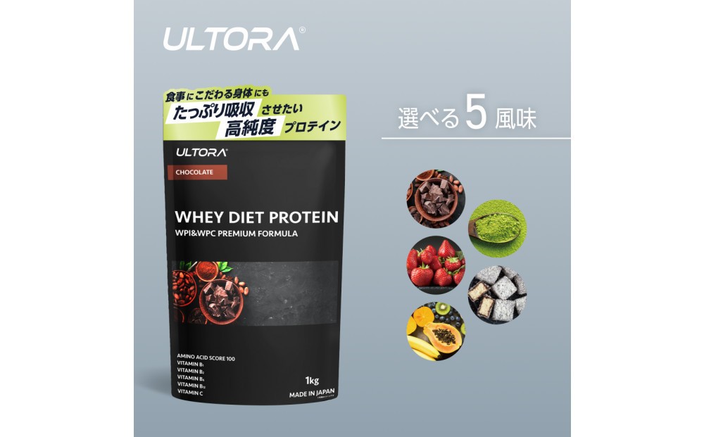 おいしい高純度プロテイン『ULTORA(ウルトラ)』 【製品の特長1:植物由来の甘味料を使用】 日常的に摂取するものだからこそ、採用する素材には1つ1つこだわり、甘味料は植物由来のステビアを使用しています。 【製品の特長2:WPIブレンド】 こだわり抜いた製法で最適な成分を編み出し、より純度の高いプロテインを実現しました。 【製品の特長3:飲みやすさへのこだわり】 プロテイン特有の甘さや粉っぽさをなるべく抑え いつでもスッキリ飲めるテイストを追求しました。 【製品の特長4:溶けやすさの追求】 シェイカーに入れて3秒でしっかりと溶ける。ユーザーの90%がその溶けやすさを実感しています。 【製品の特長5:7種類のビタミンを配合】 水溶性ビタミンは体に蓄積されないため、毎日の食事から摂取する必要があります。ULTORAのプロテインは水溶性ビタミンを7種配合することで、日々の栄養バランスをサポートします。 【お召し上がり方】 水や牛乳150ml~200mlに対して、本品を付属の計量スプーンすり切り2杯(約30g)を目安に、シェイカー等で溶かしてお召し上がりください。 【おすすめ摂取タイミング】 ULTORAのホエイダイエットプロテインは、あなたのウエイトコントロールを応援するために、1日2~3回程度、以下のタイミングで飲むことをオススメします。 (1)起床後の乾いたカラダに (2)コバラが空いた時の間食代わりに (3)トレーニング後に その他にも、タンパク質が不足していると思われる場合はお好みでお召し上がりください。