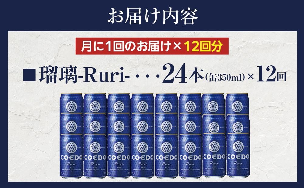 軽やかな口当たりながらも、深みのある味わい コエドの缶定番 瑠璃 24本入ビール 【12ヶ月定期便】瑠璃-Ruri- 350ml缶 24本入り / お酒 プレミアムピルスナービール 地ビール クラフトビール 埼玉県 特産品