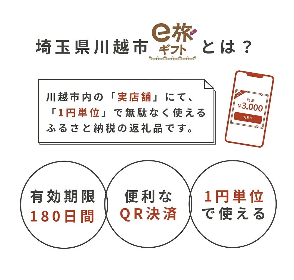 旅先納税・小江戸かわごえe旅ギフトとは? 川越市内の加盟店でお使いいただける電子商品券です。 飲食店・アクティビティ・宿泊施設などの店舗で、1円単位から使用が可能です。 ぜひ旅先納税を利用して川越観光を楽しんでください! 小江戸かわごえe旅ギフト発行の流れ (1)ポータルサイトから「旅先納税・小江戸かわごえe旅ギフト」を返礼品として選択し寄附を申し込みます。 (2)入金を確認してから5営業日ほどで登録いただいたメールアドレスへ”小江戸かわごえe旅ギフト”のURLが記載されたメールが届きます。(発行までに5営業日ほどかかりますので、ご注意ください。) ※メールアドレスをPCなどに設定されている場合は、適宜スマートフォンへメールを転送しご利用ください。 (3)URLをタップすると小江戸かわごえe旅ギフトが表示されますので、加盟店にてご利用ください。 ※すぐにご利用されない場合は、メールを保管又は小江戸かわごえe旅ギフトのページをブックマークに保存してください。 ●小江戸かわごえe旅ギフト加盟店一覧(以下のURLからご確認ください。) https://e-tabi.koedotabigift.jp/shop/ 関連キーワード:券 金券 人気 おすすめ
