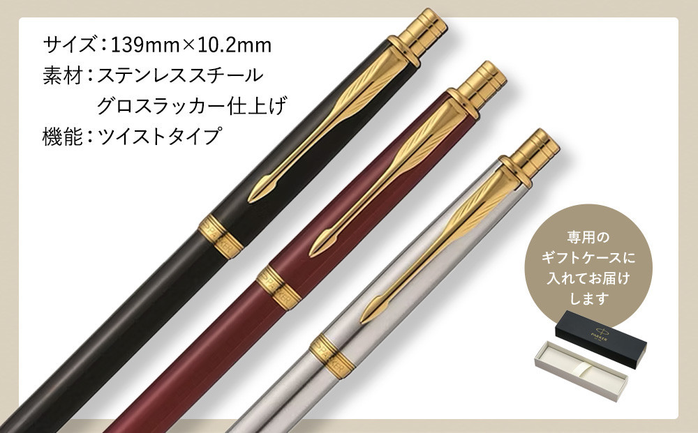 高級感とモダニティを追求したクラフトマンシップにより、磨きがかかったディテイルへのこだわり。ペンの外観だけでなく、手にした時の心地よい感触までをもこだわり抜いて開発されました。一流品としての優雅さと気品に満ち溢れ、どんなシーンもエレガントに彩るパーカーの代表作です。ラックブラックGT、レッドGT、ステンレススチールGTからお選びいただけます。※専用のギフトケースに入れてお届けします。