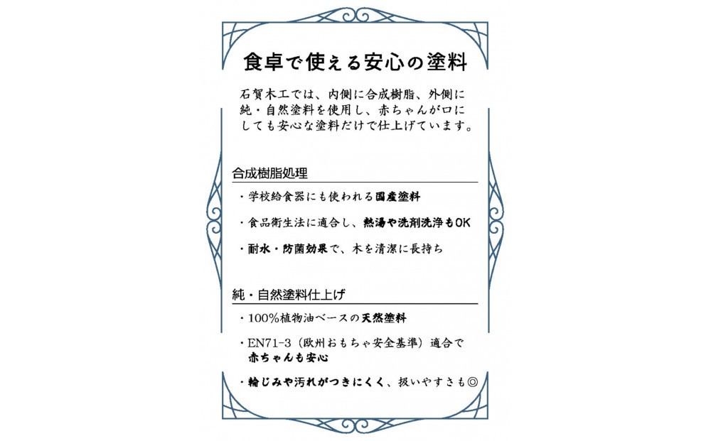 さらに、赤ちゃんのおもちゃにも使われる自然由来の塗料でコーティングしています。