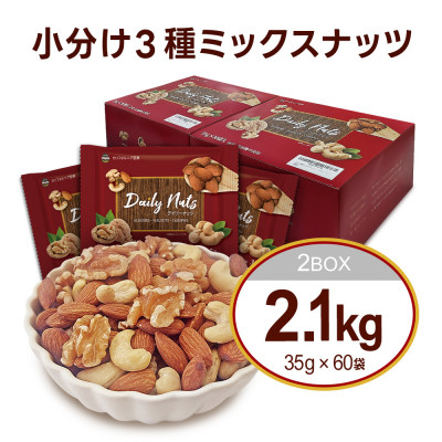 | 容量 | ■お礼品の内容について ・小分け3種ミックスナッツ[2.1kg(35g×60袋)] 製造地:日本 ■原材料・成分 アーモンド(アメリカ産)、くるみ、カシューナッツ 栄養成分表示:(1袋(35g)当たり) エネルギー220kcal / たんぱく質6g /脂質20.5g / 炭水化物6.8g / 食塩相当量0.004g |