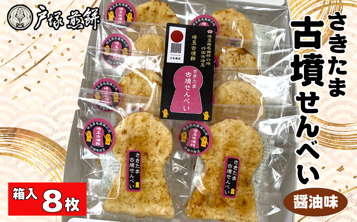 日本遺産 埼玉古墳群 さきたま古墳せんべい 8袋 箱入 / お菓子 和菓子 煎餅 おやつ 醤油味 国産炭火 香ばしい 深い味わい 前方後円墳 こふん 埼玉県 特産品 No.488